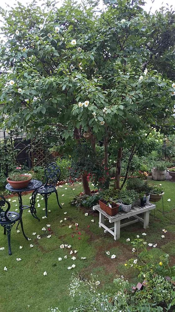 落ちた花拾い大変そうやけど芝生のグリーン💚に沙羅の花の白🤍がなんかキレイやわ〜🥰