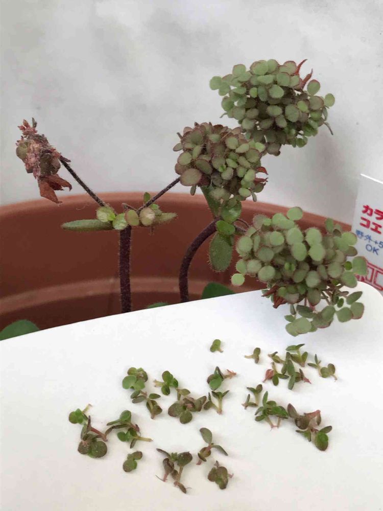 蕾付きを購入したものの、環境が変わったせいか、蕾がヨレヨレになり咲かずに終わったまま放置してたら、花房から子供がいっぱい!何だこれ。何で種ではなくて子株?
