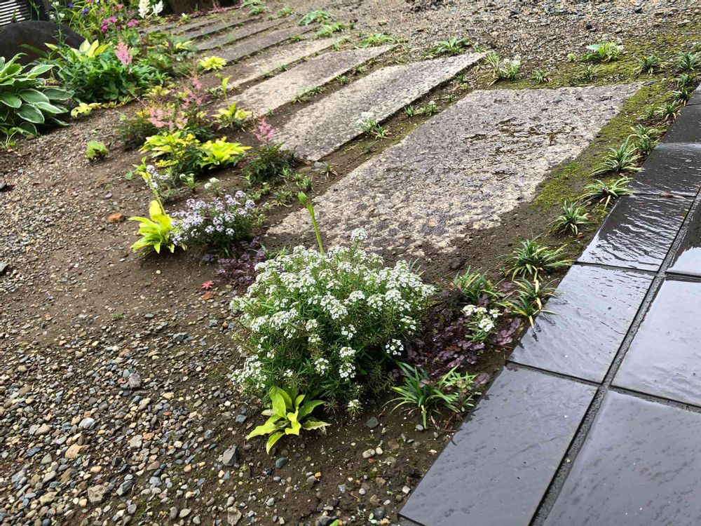 今は踏み石の周りはホスタやオダマキ、アスチルベもまだなので寂しげです。