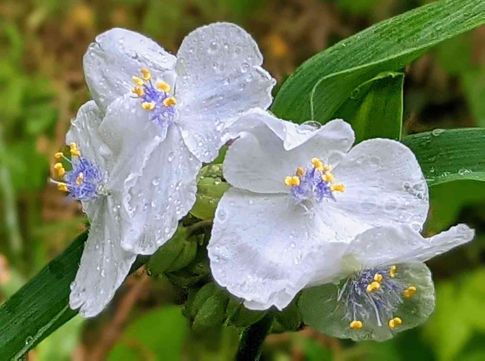 白花ムラサキツユクサも透明になるほど雨に打たれて。