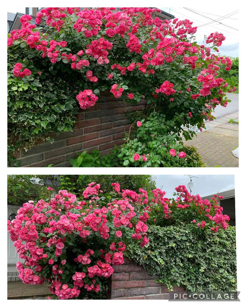 台風で倒れてしまったアーチを撤去したので、塀に寄り掛からせているから、樹形のまとまりが良くありません😕