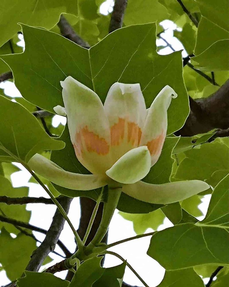 モクレン科ユリノキ属の落葉高木。北アメリカ原産。明治時代初期に日本に入り、1875年(明治8年)、新宿御苑に植樹されたのが日本初という。高さ30mにもなる木で、成長がよく公園樹や街路樹として広く植えられる。幅広の葉は滑らかで薄くて硬く、掌状に浅く4または6裂し、長さ3~6㎝の長い葉柄を持ち互生する。花期は5~6月。花はチューリップに似た鐘形花で直径5~6㎝。雄しべは線形で花床下部に、雌しべは花床に多数つく。花被片は9枚で、外側の緑白色の萼片3枚が反り返る。花弁のオレンジ色のラインから蜜が出る。秋には葉が濃い黄色に黄葉し鮮やかだが、すぐに褐色化しやすい。果実は細長い翼果が集まり松かさ状となった集合果で秋に熟す。上向きにつき、翼果はくるくる回転しながら落下する。種子は翼果の付け根のかぎ状部分にある。1~2個つくが秕(しいな)も多い。北アメリカでは蜜源植物として利用される。ネイティブ・アメリカンは本種の材でカヌーを作り、棺桶にも用いたという。