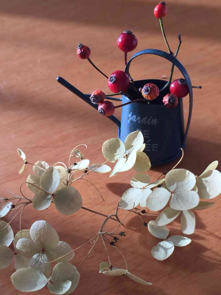 ブルーの入れ物に赤い実、白いアジサイ