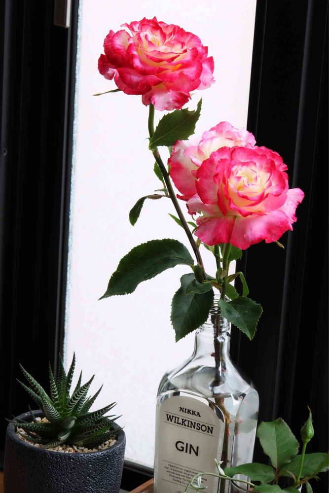 昨夜、帰宅後に庭を見たら薔薇が綺麗に咲いていました。雨が降る前に切り花で家の中に緊急避難....花瓶が😱...急遽!お酒の空き瓶を代用しました😅