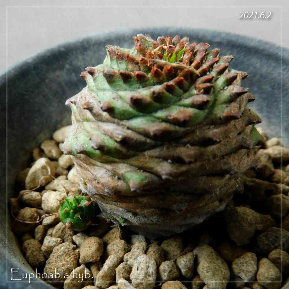 オベサ交配種ということで買って育てて早何年。やっと子吹きし始めた。オベサというより掛け合わせたもう一つの血が強く出てるみたい。鉄甲丸か蛾眉山か。らせん模様が美しい。もっと育って。