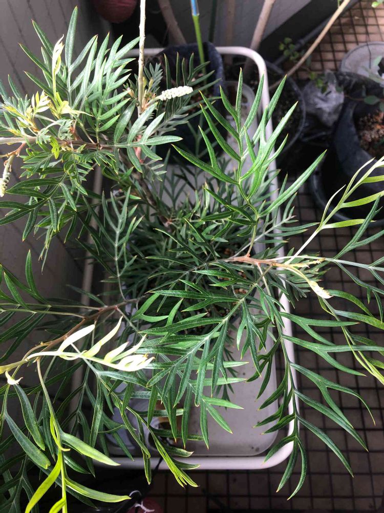 グレビレアココナッツアイス。昨年センパフローレンスが一か月経たずに猛暑の蒸れでダメになってしまってのがトラウマで、ずっと買えなかったのだけど、夏が来る前に再挑戦。
