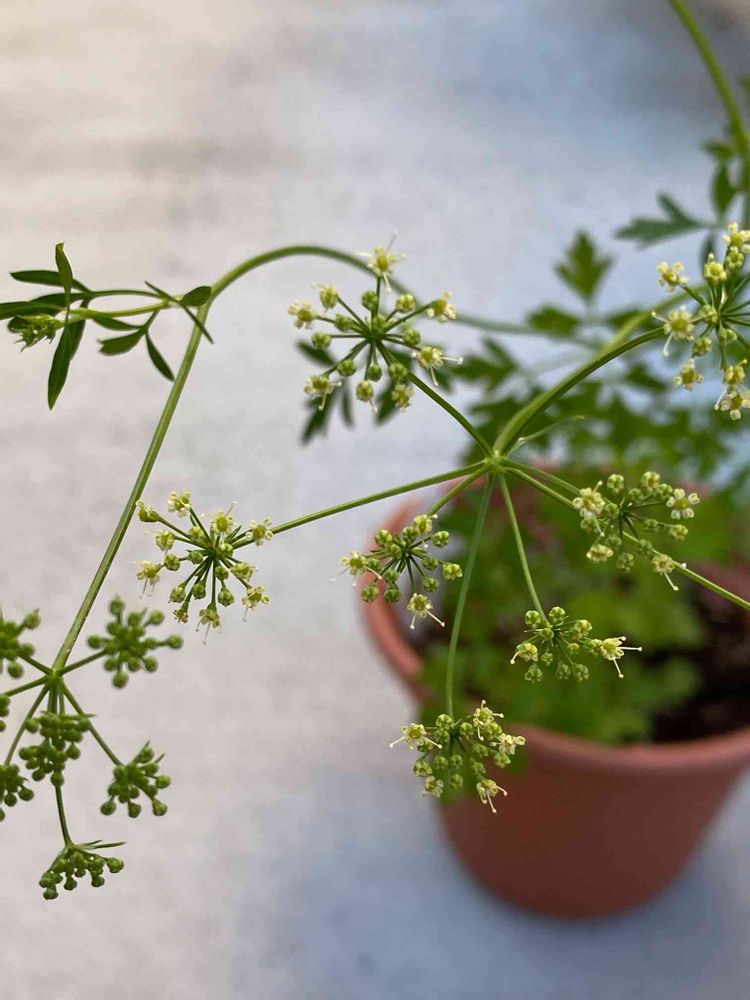 どんなお花が咲くのか知りたくて伸び放題になりましたイタリアンパセリのお花?虫眼鏡🔍が必要です😊