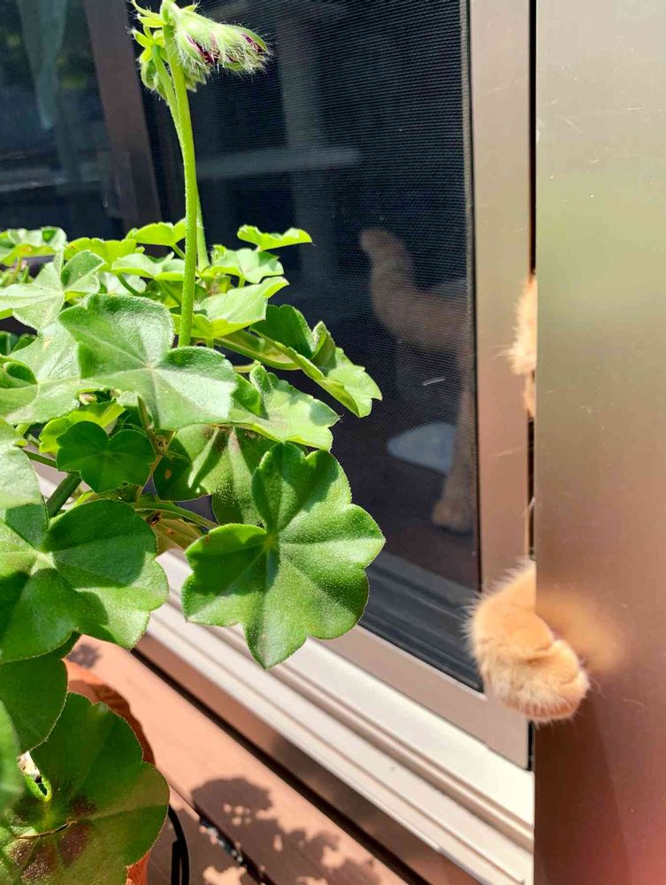 あー脱走しようとしてるー お手手が可愛い❤️ゼラニウム蕾が上がってきて良かったねー