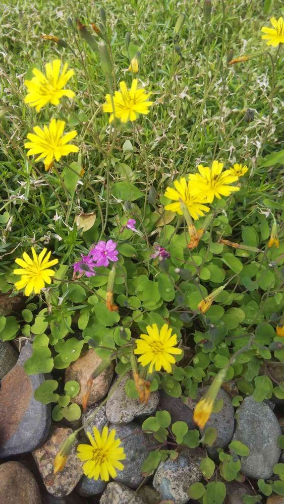 昨日までの雨があがり散歩の途中の空き地に可憐な花を見つけました。イワニガナという名前の雑草ではないかと思います。