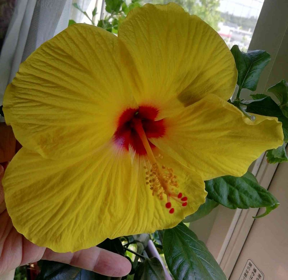でっかいどう!わたしの小指を入れてみました。普通より大きい手です。それよりはるかにデカイハイビスカスちゃん👀👀👀びっくりしたぞー!!!🌼🌼🌼