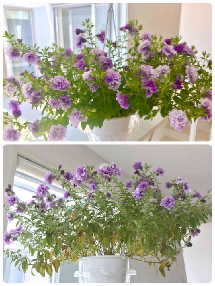 ペチュニアは枝先にしか花がつかないですよね?このまま育てていくとどんどん間延びした株になってしまいます。花が小さくなってるのは根からの距離が遠くなって養分がなかなか届かないせいだと思うんですよ。その証拠に下葉が枯れてますよね?少しでも経由するところを減らしているんです。