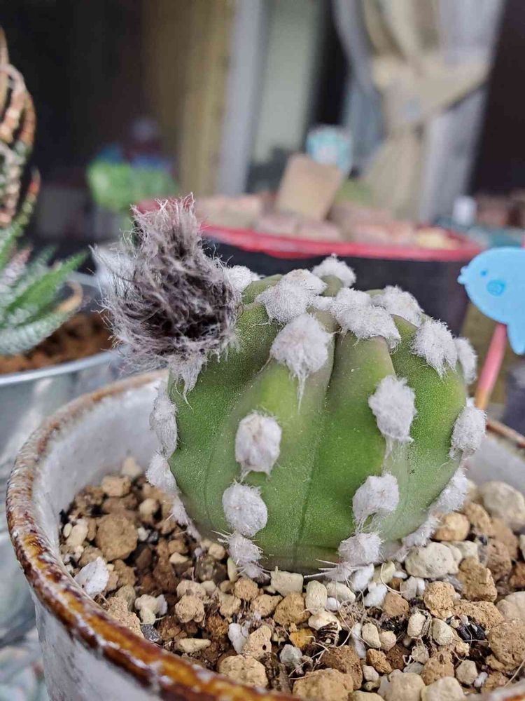 うちのちょっと似た雰囲気のサボテンさん、てっぺんにお花が咲いたよ。