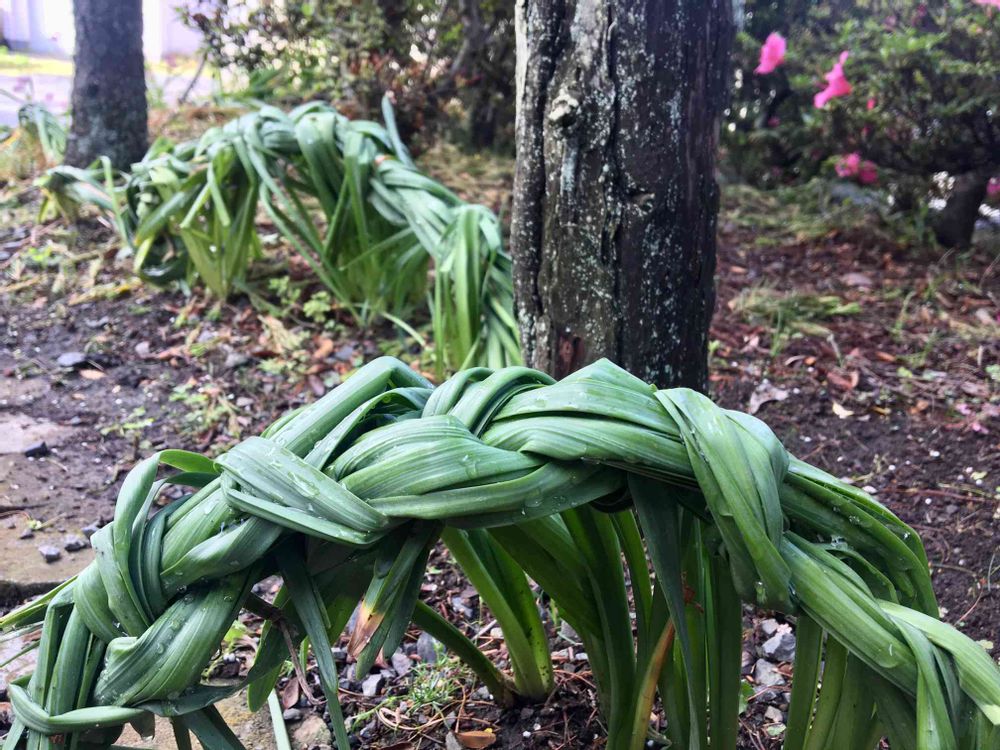 水仙は花が終わっても出来れば葉っぱが黄色くなるまで切りたくないんですけど、バラバラと広がってしまって邪魔になるので😊お友達の真似してみました🍀