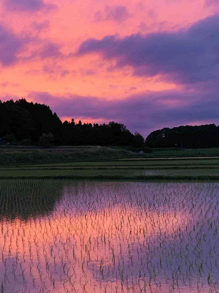 @野ばらさん、きれいな夕焼け〜✨💕😍田んぼの風景、故郷の(山形)を思い出します🥲