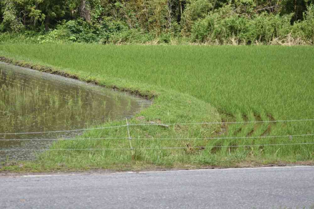 畦(アゼ)を境に、左側が最近新たに田植えされたエリア、右側が4月中旬に田植えされたエリア。この1ヵ月半ほどのタイムラグを作る意図は何か。収穫期の分散(時間分散)によるメリットは、単に人手不足だからか、それとも米の販売価格の安定化のためか。
