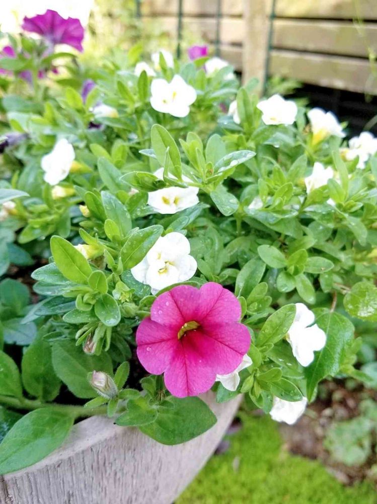 白八重は冬越しし続け4年目、カリーは昨年購入、挿し芽が冬越ししたもの。冬越しすると色や模様が変わる品種もあるけど、この2つは変わらないです😃 左奥のピンクは別のペチュニアです