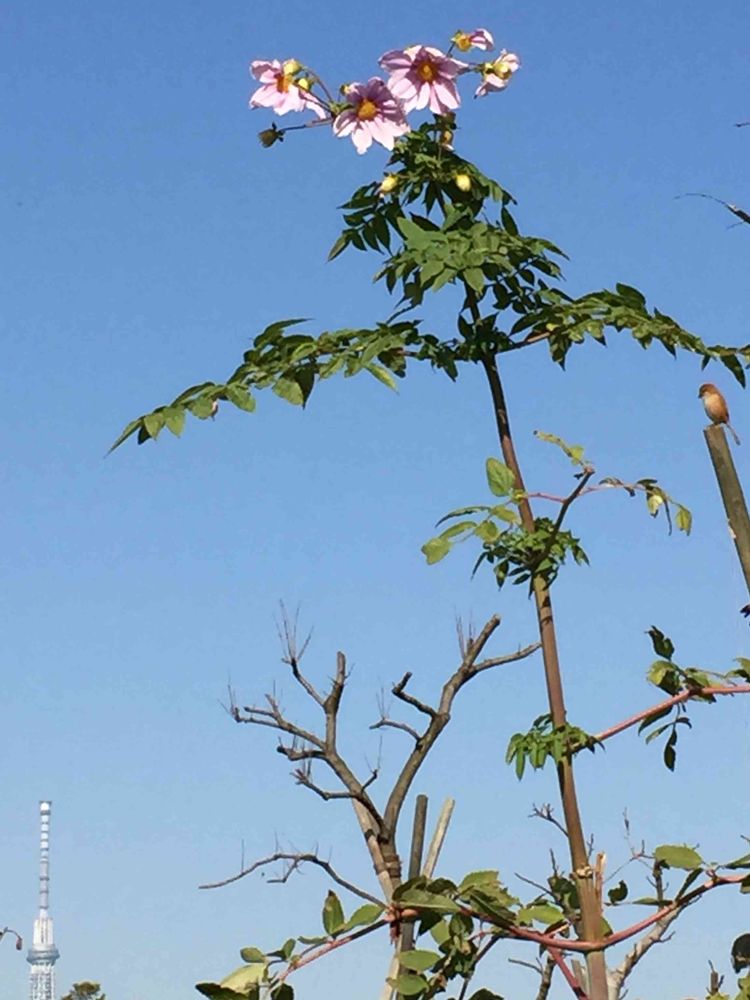 残念ながらアップで撮れませんでしたがスカイツリー、皇帝ダリア、モズが一緒に収まりました。