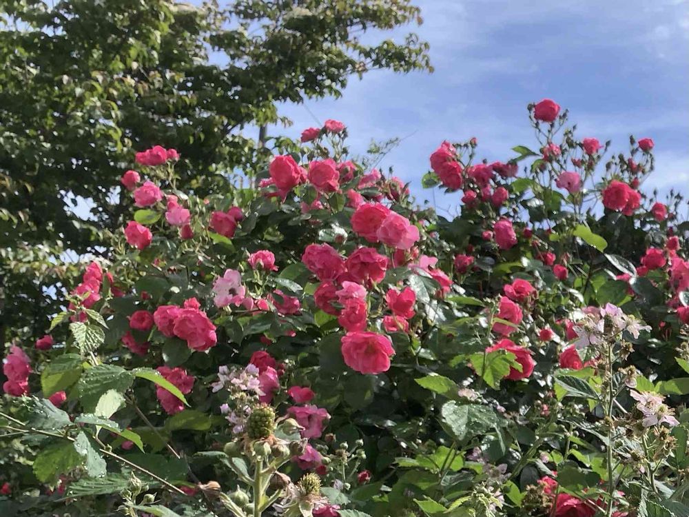 やっぱりバラには青空が似合います🥀手前にはブラックベリーが既に形になってきました♪今年はかなり間引いたんですがそれでも負けじとたわわに実をつけてます🤗