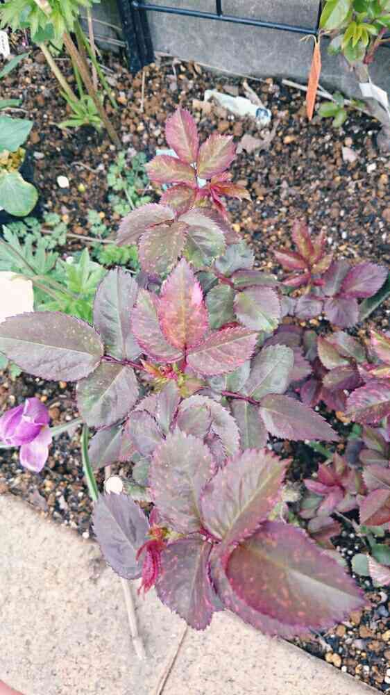 バラ「炎(ほむら)」の新芽。斑入りになる珍しい葉っぱなのですが、芽出しはあまり目立たなくブロンズ調の落ち着いた色合い。