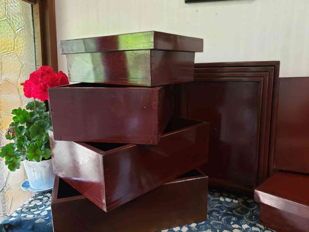 5月31日に投稿した写真はロシアのお土産のマトリョーシカの様に1個ずつ取り出しが出来 七つの深い箱に。そして写真に写らなかった七つの浅い箱を各々にかぶせると蓋付箱になります。別々にすれば全部で14個の箱。