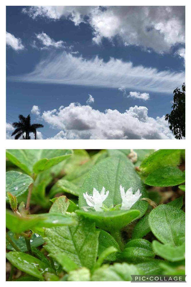 夕方の時間に裏庭で下の草花や、上の雲や夕焼けを見ていています🤳😊