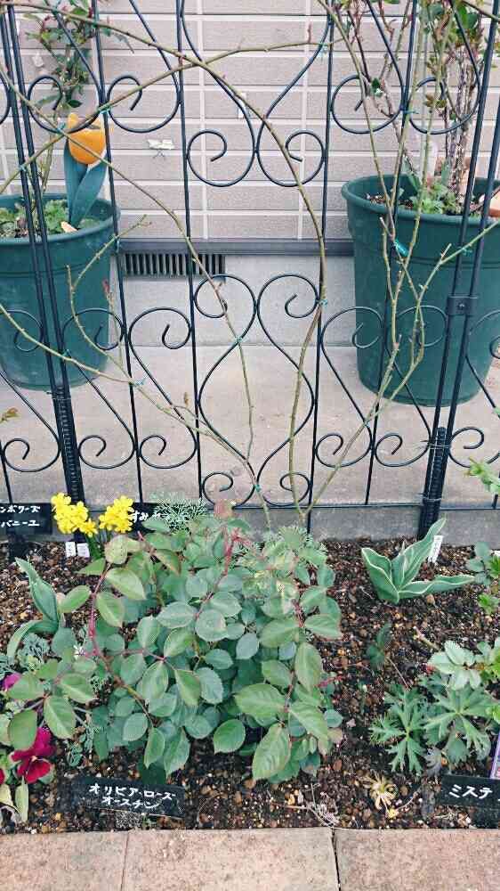 バラ「すみれの丘」。芽出しが遅い品種なので、まだ動き始めたばかり。 手前のオリビアローズオースチンは昨年発表の新品種。