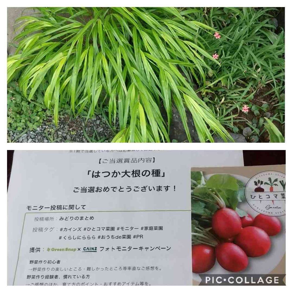 私も、当選しました。カインズさんの「ひとこま菜園」モニター、はつか大根の種。