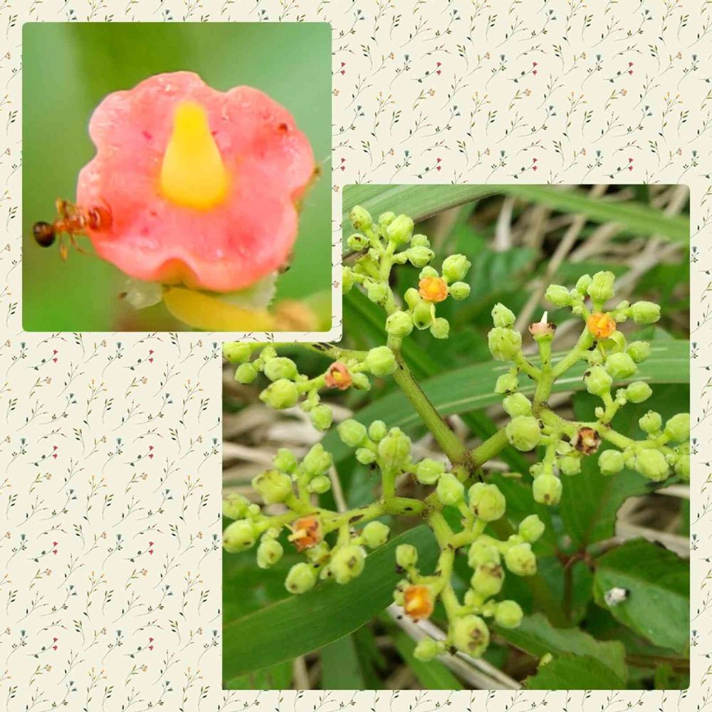 変わったお花だなとネットで調べたら、薄緑色の花びらが4枚、雄しべが4本、オレンジ色の花盤の中心に雌しべが1本あります。