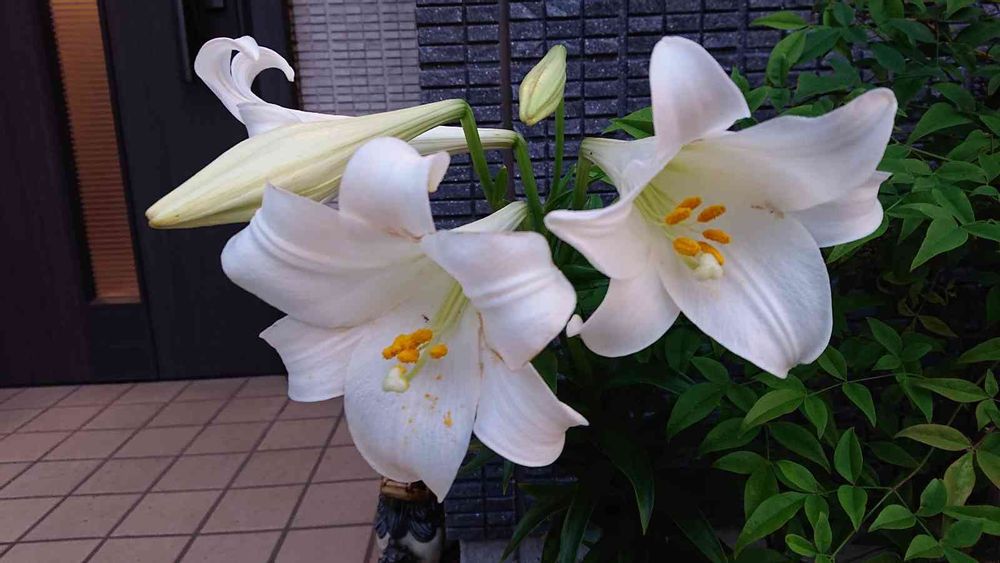 玄関のテッポウユリが盛りです。薫りも立っていて、清廉な美しさですね❣️。
