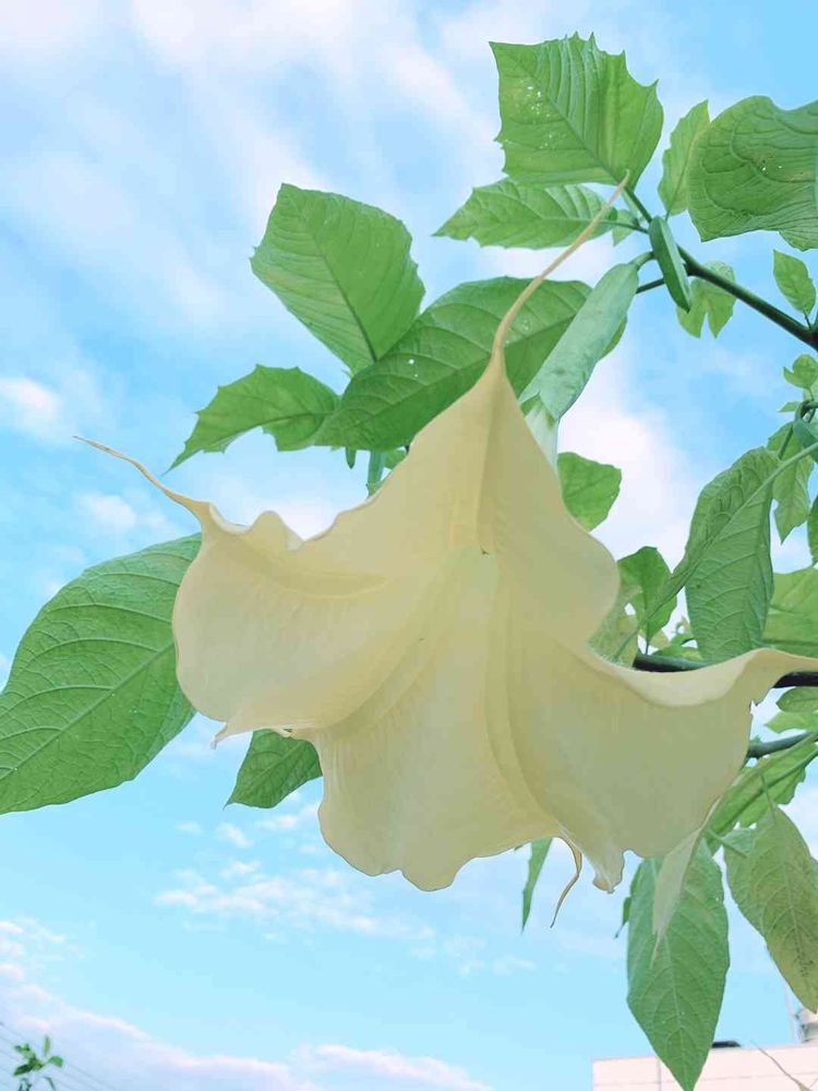 エンゼルトランペットさんは、下を向いて咲くお花なので、下から空を見上げて撮影するこのアングルは難しいかったです😆