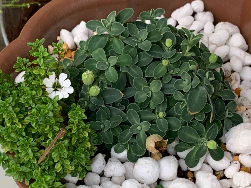 横の細かい葉っぱはゴールデンレモンタイムのポットを分けて後から追加で寄せ植えたものです。