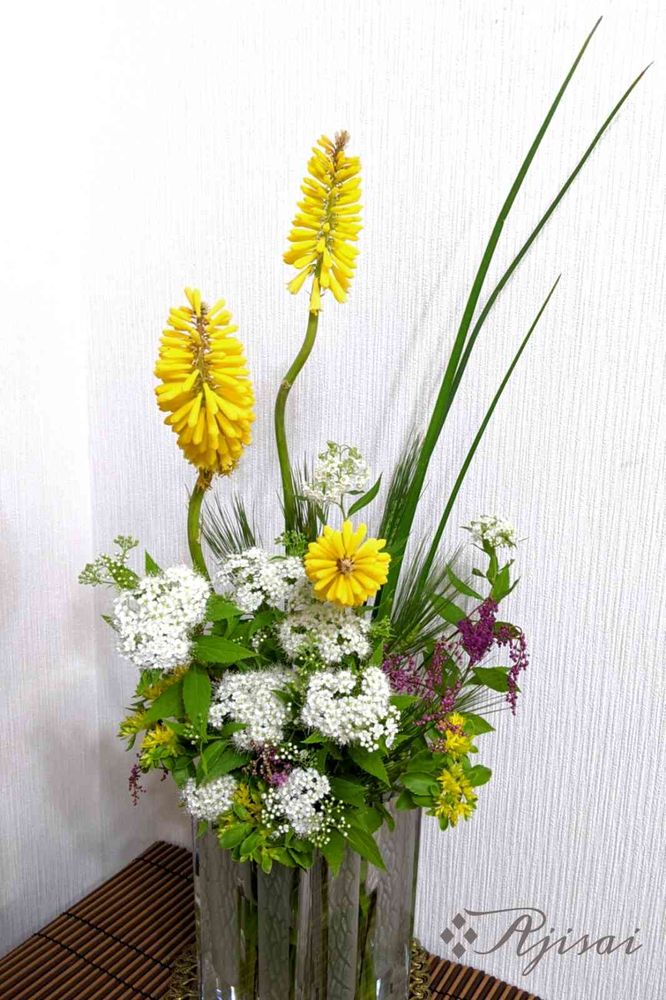 キリンソウは、生け花の下の方にある 赤いスモークツリーの下にあります