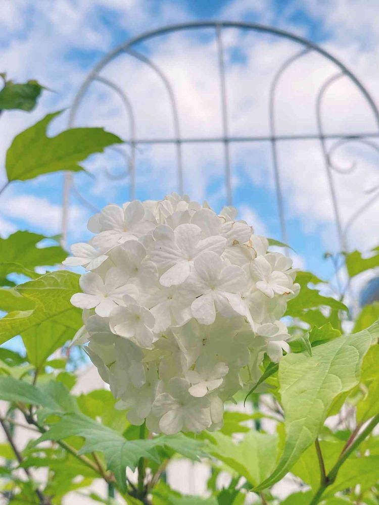 空の薄いブルーと大手毬の白と葉っぱの淡いグリーン✨✨