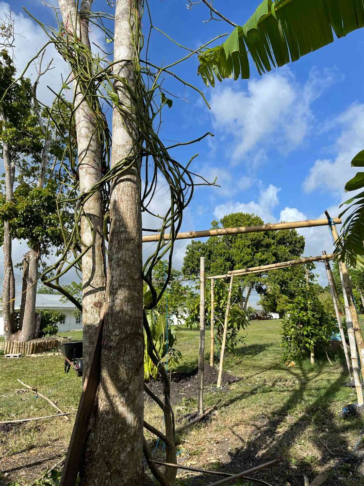 たくさんあった枝と葉っぱをパッツン切って木の上の方にくくりつけました。このまま木に絡まってくれたら良いけど予備に支柱もまた立て直し中です。