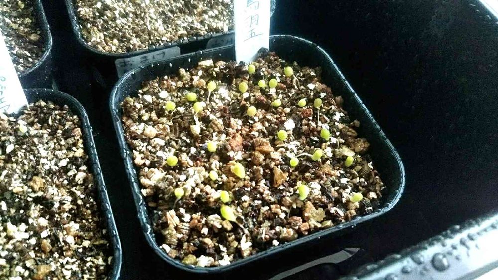 最初の発芽確認から五日後です。どんどん芽が出てきています。烏羽玉以外の子達は変化なし。