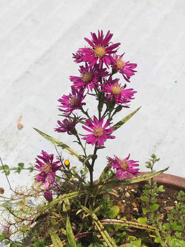 花はシオンのようで、葉が四方に広がるので孔雀草のように見えますね。