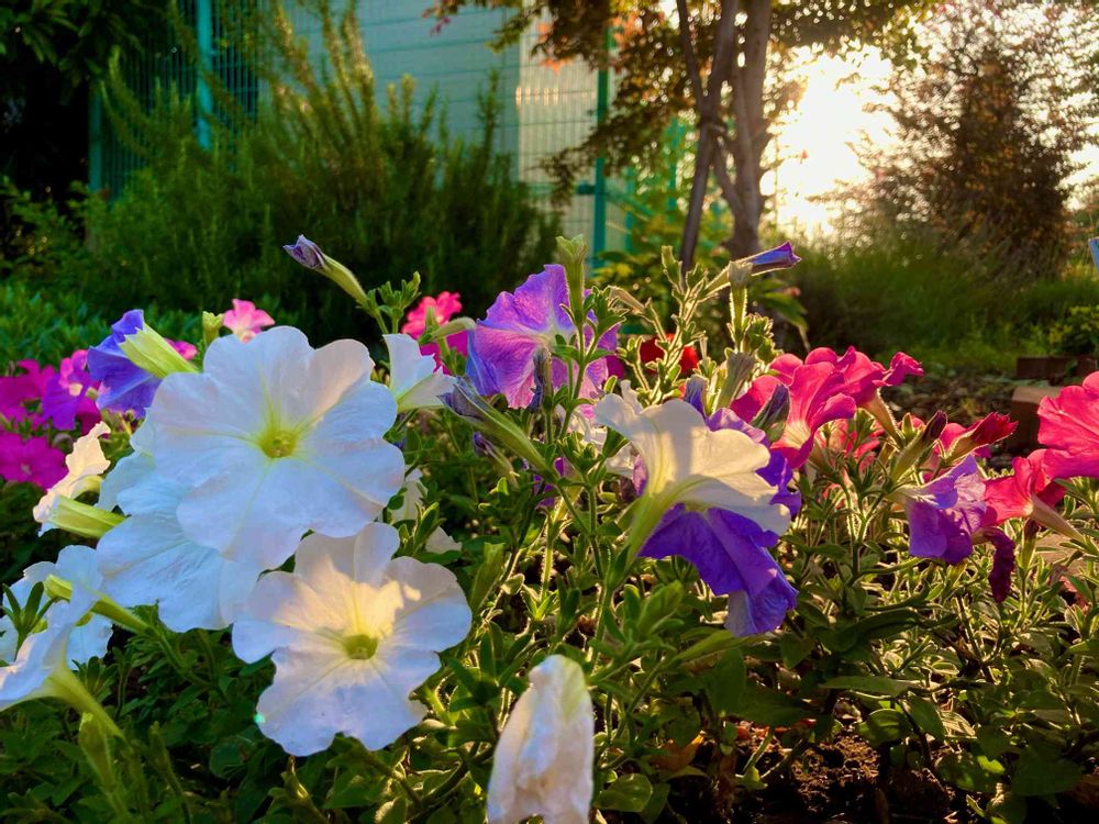 今日のお花はサフィニア、花言葉は咲きたての笑顔、朝陽を浴びたサフィニアはまさしく花言葉のようでした。