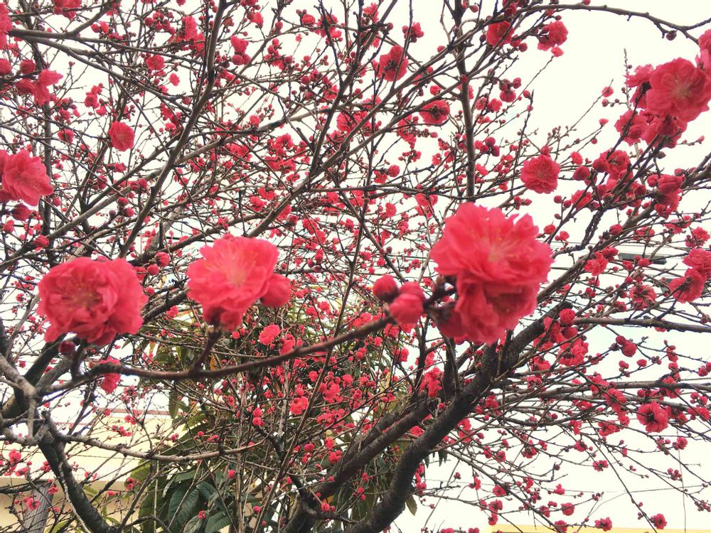 こちらも桜。 真っ赤です。 白っぽいソメイヨシノの桜の中に、真っ赤な色は非常に映えます。