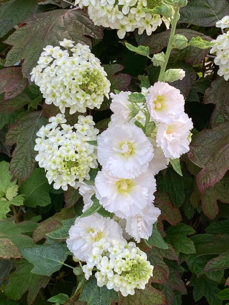 あらまぁ❗️ カシワバアジサイの中に、ひょっこりと白いタチアオイが咲いてました‼️👀🤗