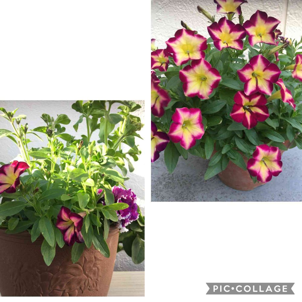冬越ししたピルエットパープルさんの鉢から出てきた見覚えのないペチュニアさん(左)が現れたので小さな鉢に移植し、ピンチを何度かしていたら、小さな1鉢ができました(右)