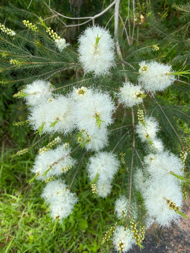 ご近所のメラレウカスノーインサマーの大木に、ホワホワがいっぱい🌿🤍☁️🤍🌳