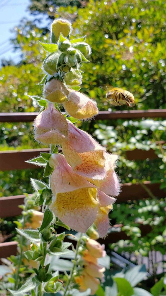 ジギタリスは花の集合住宅みたいなものだから、花粉集めも効率的❢😁👍途切れることなく羽音がしています。