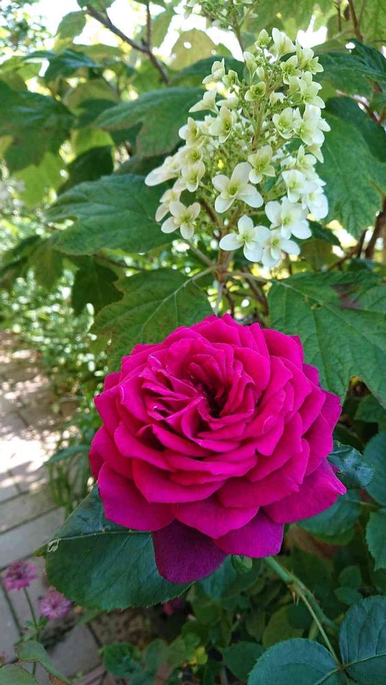 柏葉紫陽花とコラボですね。木陰の🌹素敵な色ですね。