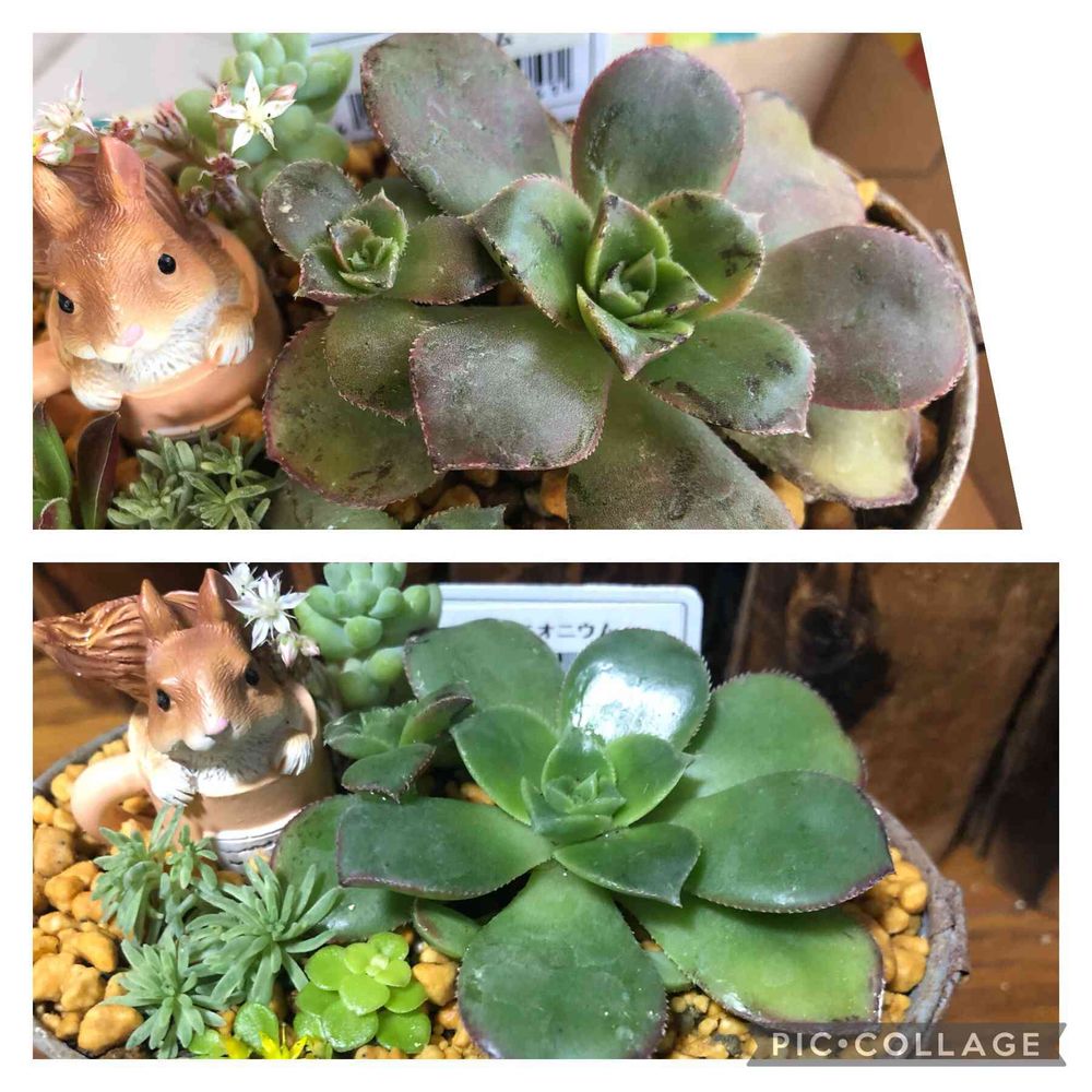 先日、寄せ植えした、100均のアエオちゃん、プレゼント🎁で渡そうと思ってたのに、急に色が変わり、シミ?傷?の様なものが…💦💦焦げてしまったのでしょうか⁉️