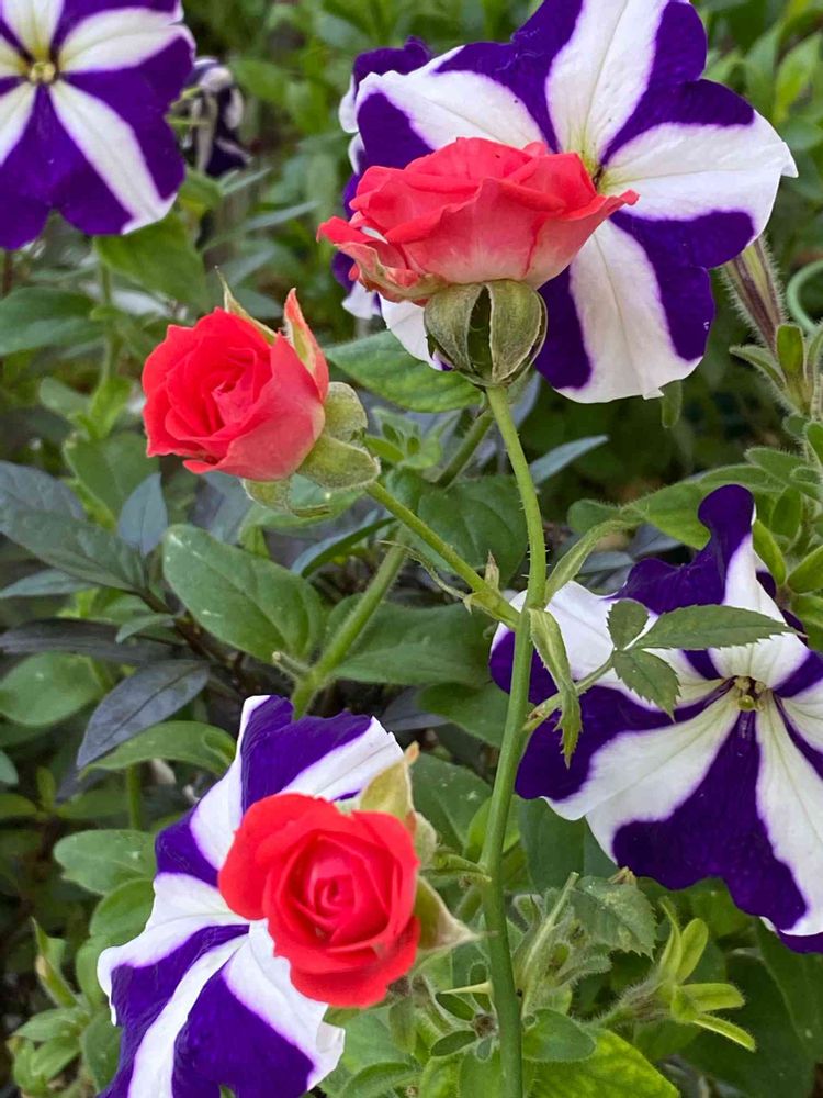 白と紫のペチュニアに、真っ赤なミニバラ、なんてお洒落な色彩。白が入ることで、より爽やかで素敵になっています。❤️☆💜 💜☆❤️