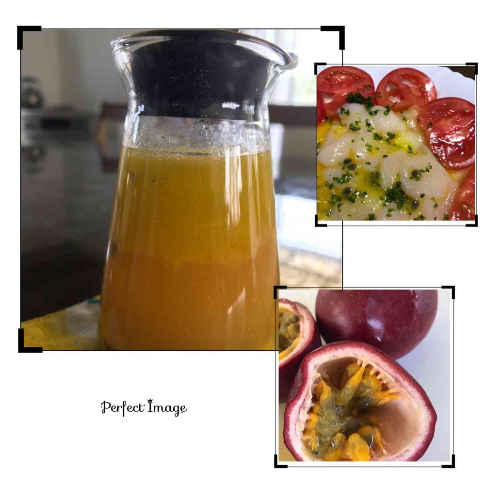 パッションフルーツ、酢(白ワインビネガー)、オリーブオイル、塩、胡椒、混ぜただけ〜デス😆