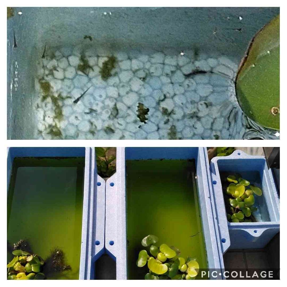 濁った容器には、それぞれ、親メダカが、10匹ずつくらい入っています。小さい容器には、子メダカがいます。ここには写っていませんが、小さい容器も2個あります。🍀