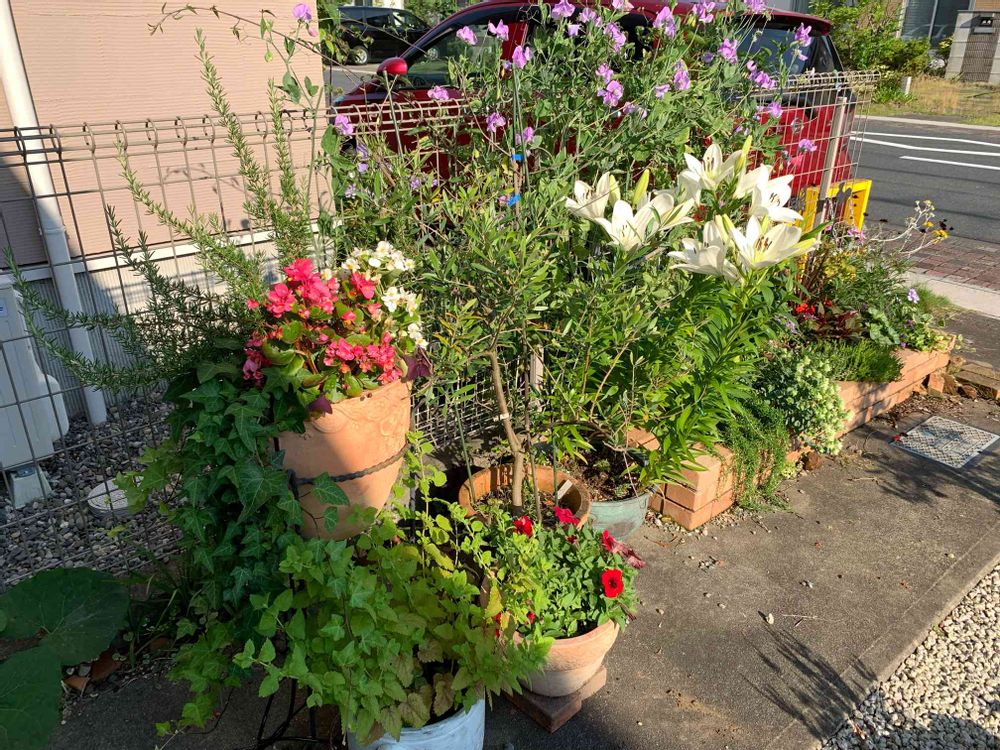 朝日だけが当たる東側のらくらくレンガ花壇。鉢植えのスカシユリを移動しました。日が当たらない方が花が長く楽しめる気がするから。
