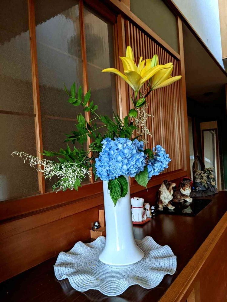 珍至梅、紫陽花、透かし百合今旬の花がさきました💙🧡💛💚さわやかです🍀😁