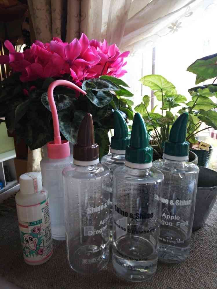 口のサイズがペットポトルと同じなので100円ショップなどにおいてある水やりキャップをつけてあちらこちらにおいてます